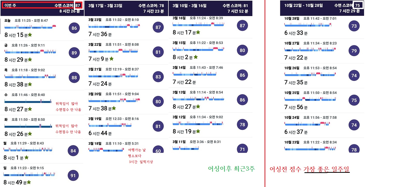 그후는 사정(여행, 뒤척임이 많아 점수가 나타나지 않음) 이 있는 날 빼고는